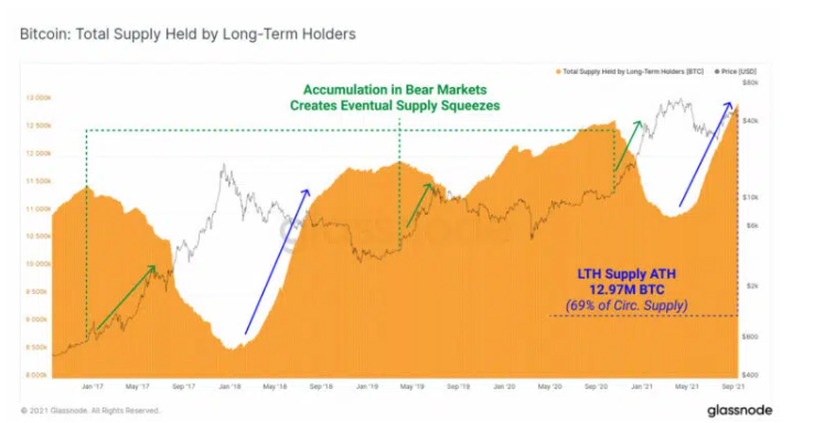 In the graph below, you can see two things: long term holders are at a historical high, and the accumulation of Bitcoin off-exchanges creates a supply shortage that typically triggers a price increase.